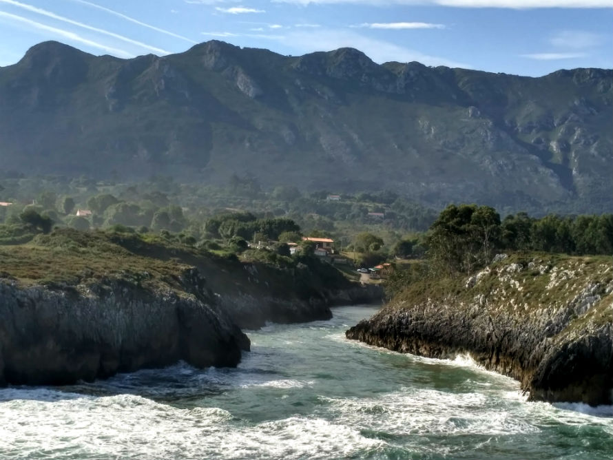 El espectáculo visual que se abre al llegar es grandioso. Hacia el Este encontramos el coloso pétreo del murallón desde el que escupen los llamados “Bufones de Pría”. Bajo nuestros pies desemboca el Río Guadamía formando, en marea baja, la Playa de Guadamía. Esta boca de mar separa los Concejos de Llanes y Ribadesella.