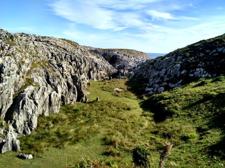 Desde el Área Recreativa comenzamos a andar dirección Oeste por el serpenteante sendero que transita al borde de los acantilados. Al paso nos irán saliendo los llamados “pozos secos” que salpican la zona. Éstas oquedades disponen de una gran perímetro. Además, las rocas calizas que los protegen, se organizan de forma concéntrica como almenas puntiagudas. Dejando en el centro un fondo negro donde golpean las olas. Así, el agua del mar entra como un torrente a pesar de que alguno de ellos guardan cierta distancia con el acantilado.