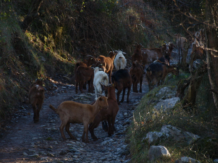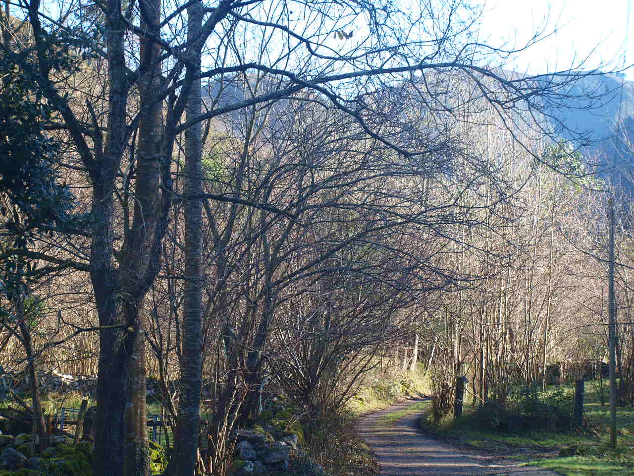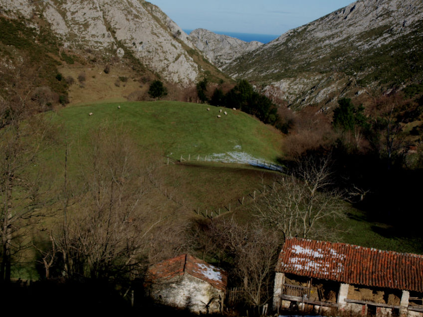 Comenzamos pues a andar desde la plaza corriendo paralelos a la vertiente izquierda del arroyo de Santianes, bajo los crestones calizos de los Picos Corona y Cabeza. Unos 250 metros más adelante cruzaremos un puente de piedra, atravesando el cauce del arroyo para proseguir ahora por la vertiente derecha del mismo. Enseguida iremos dejando atrás las últimas construcciones de la aldea, molinos rehabilitados y alguna casería típica del ámbito rural. La pista entonces inicia una vertiginosa subida hacia el valle de Peme. Encontraremos un primer desvío a nuestra derecha, marcado con un poste que señaliza la “Ruta de Enriqueta González”, pero nosotros debemos continuar por la pista en ascenso que aparece a mano izquierda. Esta, discurre entre eucaliptus y castaños por el paraje del Campo de Porro, bajo la ladera que baja desde la cima de los riscos conocidos como Los Cuetos Medios.