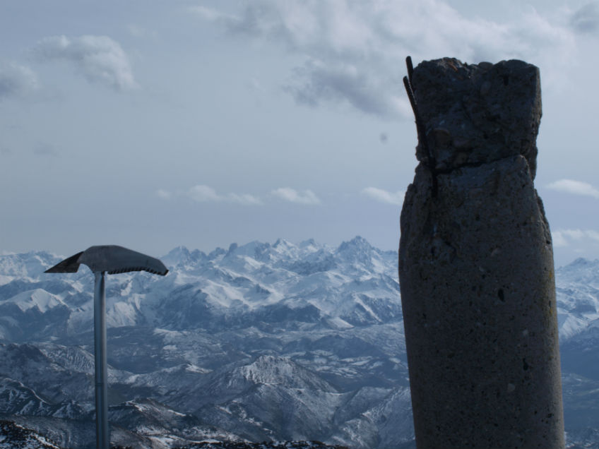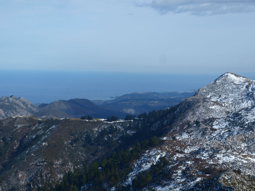 Después de llanear durante unos minutos, entre pinos volcados llegaremos a las inmediaciones del Collao de la Tabla. Aquí podemos desviarnos unos metros hacia la izquierda para observar en días claros el macizo central de los Picos de Europa, con el perfil del Naranjo de Bulnes destacando entre las cumbres más altas.
