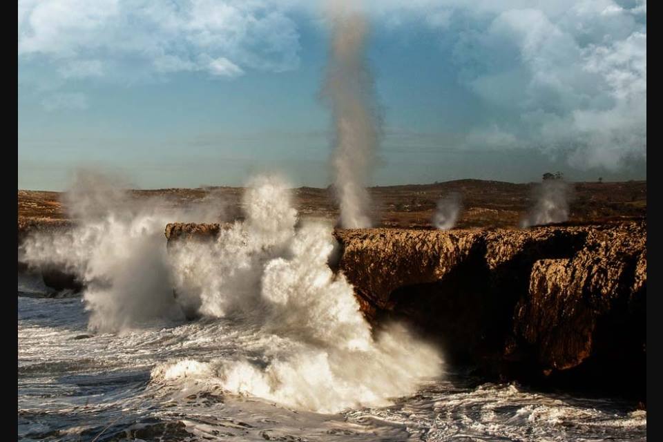 Los bufones son chimeneas naturales abiertas en la roca caliza de los acantilados. Durante siglos, el mar ha ido excavando galerías y cuevas subterráneas conectadas con la costa. Cuando el oleaje entra con fuerza en esas cavidades, el aire y el agua se comprimen y salen expulsados verticalmente por los orificios superiores.