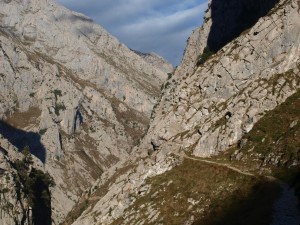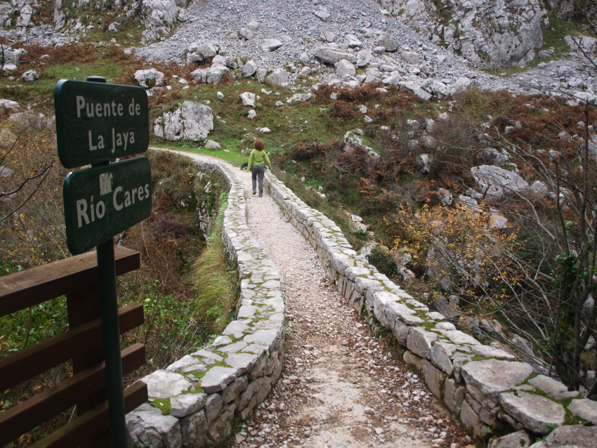 La ruta comienza en Puente Poncebos, famoso lugar de partida de la igualmente célebre “Ruta del Cares”. Aquí cruzaremos el Río Cares por el singular Puente de la Jaya, idílico y fotográfico enclave. La pista nos adentra en la canal. Un ancho camino, sube en zig-zag en fuerte pendiente en línea con la riega del Tejo que desde los altivos puertos de Pandébano baja a morir al turquesa Cares.