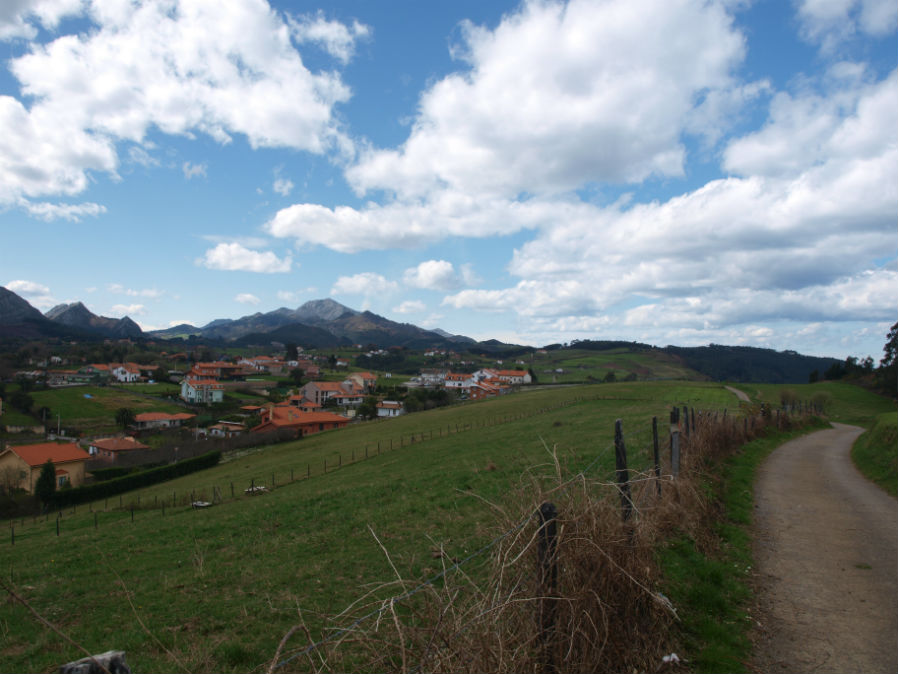 A medida que avanzamos podremos oír nitidamente el rugido que provoca el mar al desvanecerse en la Playa de Vega, la cual se nos vuelve facilmente divisable desde nuestra posición. En pocos metros llegamos al cruce de nuestra pista con el Camino de Santiago. Avanzamos a nuestra derecha por el camino empedrado con cantos rodados para acceder al pueblo de Vega por su parte más alta y a la par más atractiva. El trecho de camino que discurre hasta morir en la carretera que conduce a la playa de Vega, es ciertamente interesante.