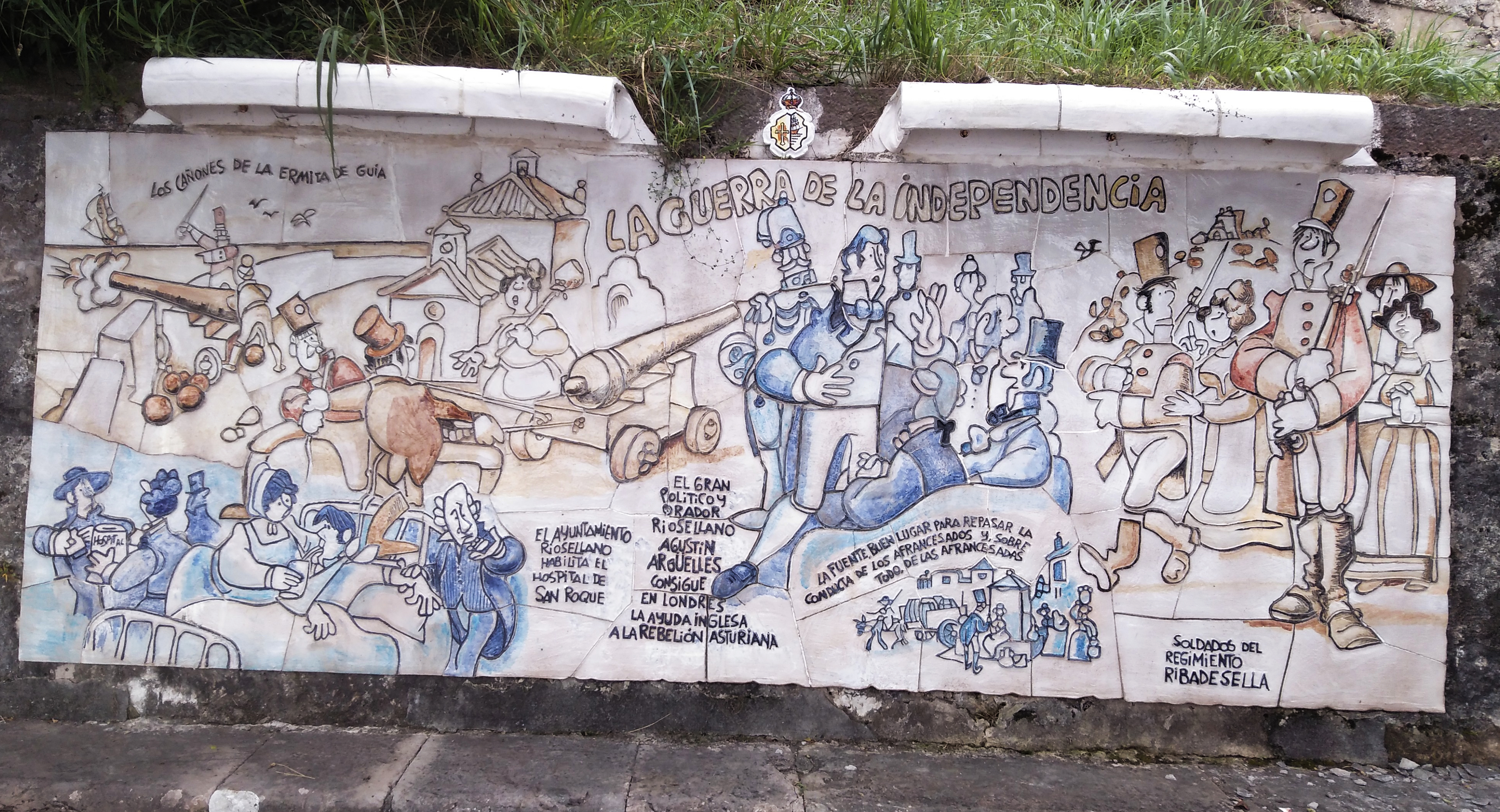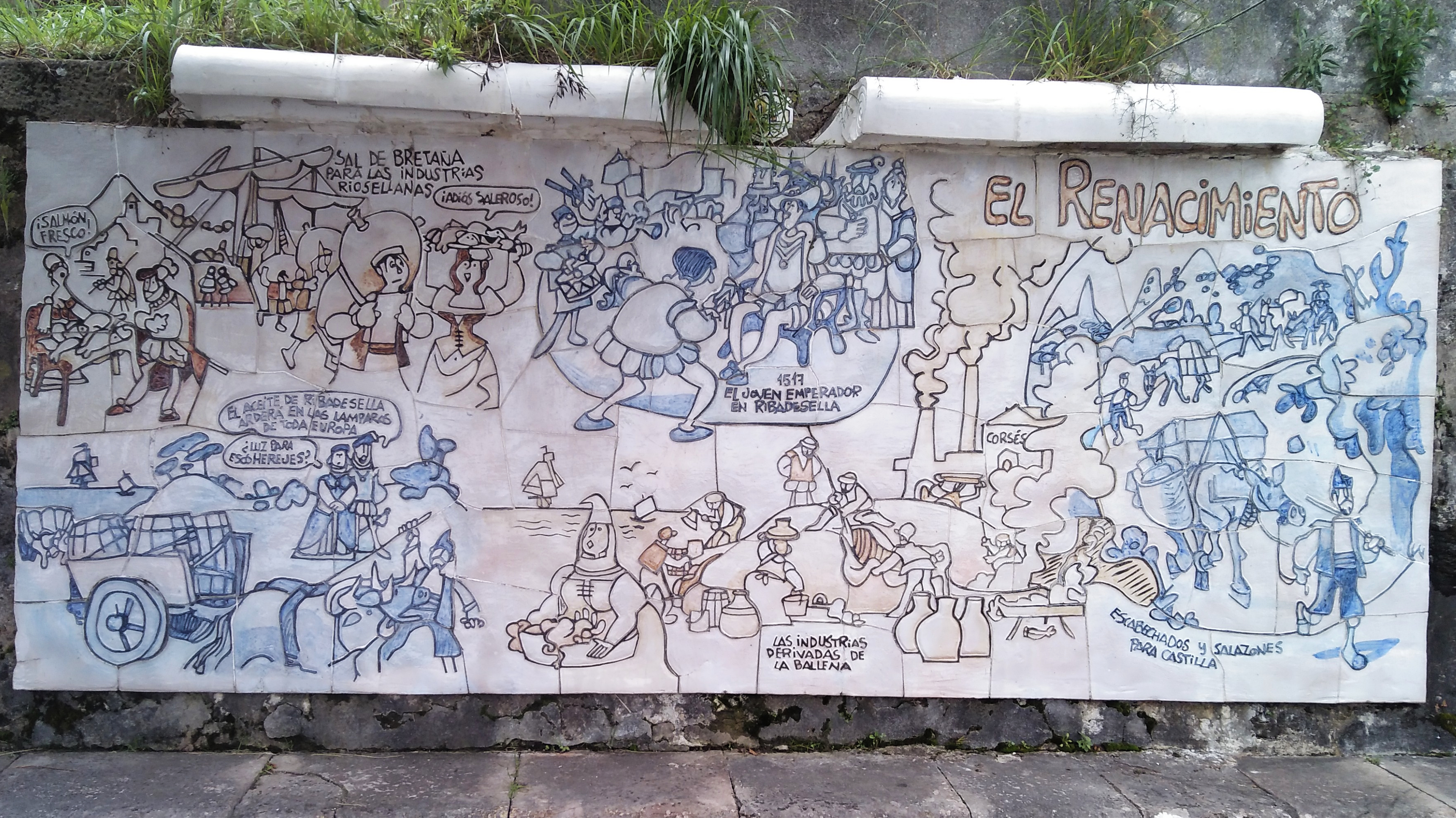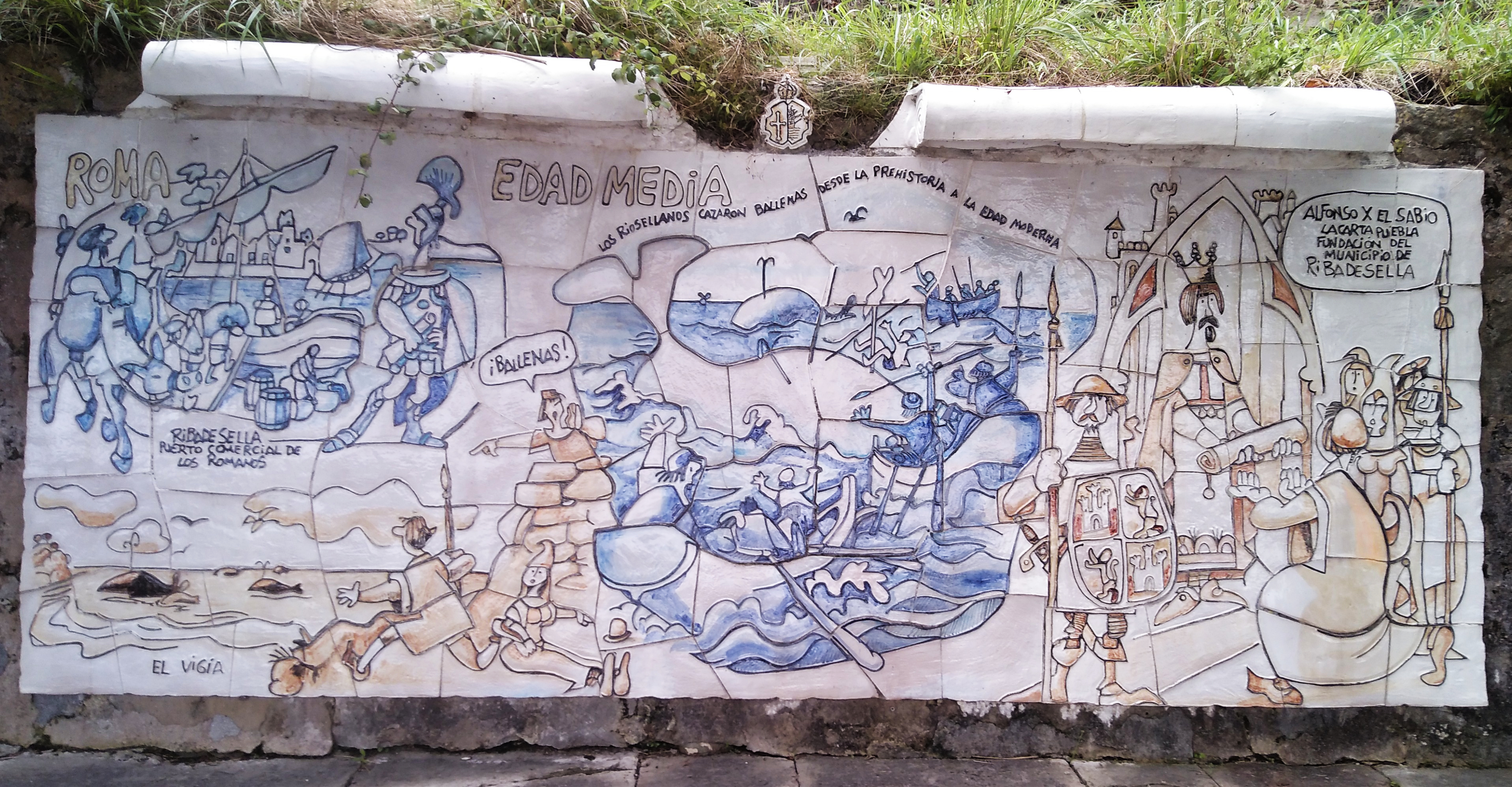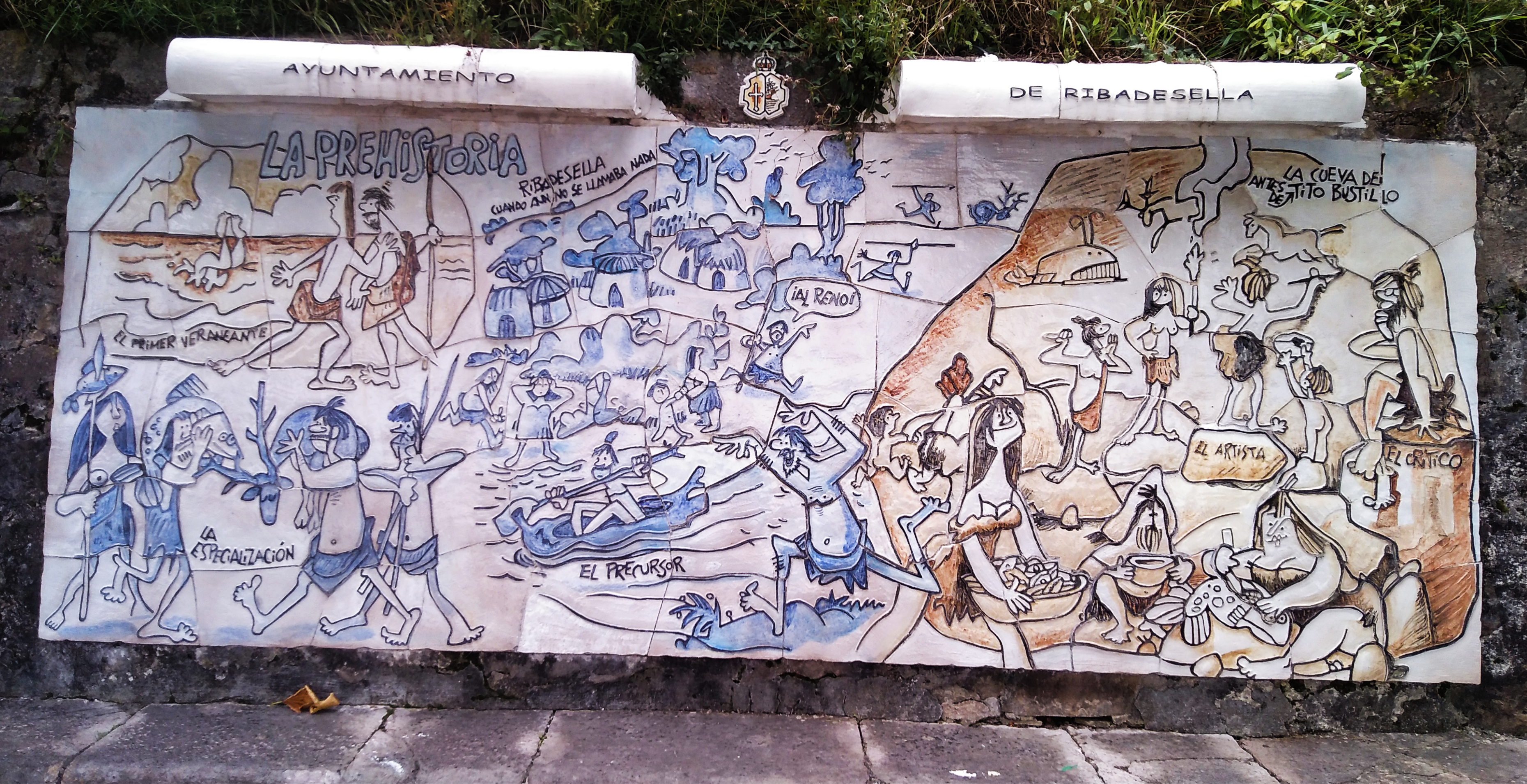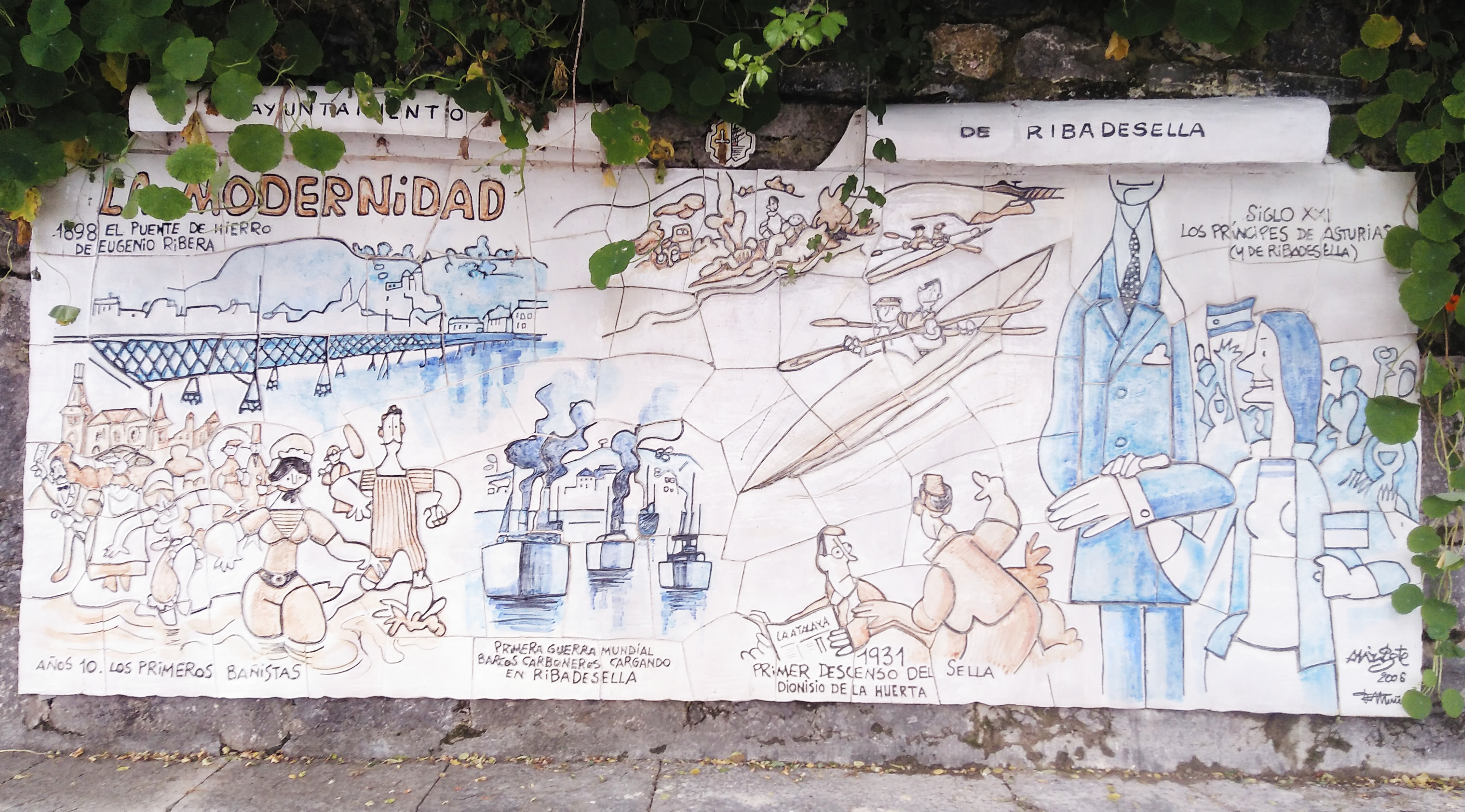 Los paneles de 3 metros de longitud representan 6 momentos fundamentales en la historia de la Villa asturiana. Desde la época de las cavernas hasta la actualidad representada por el panel de “La Modernidad”, en el cual y como broche final aparecen las figuras de los entonces Príncipes de Asturias y de “Ribadesella”, Felipe y Leticia. Y donde el genial humorista representó al hoy monarca saliéndose del plano, en elogio a la altura del personaje.