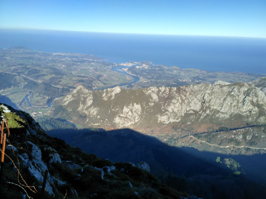 Así, superado el último esfuerzo ya sólo nos queda disfrutar del paisaje y las vistas. Hacia el Norte el Cantábrico y Ribadesella con su desembocadura del Sella. Al Sur los Picos de Europa. Al Oeste la Sierra del Sueve y su pico Pienzu. Y al Este la encrucijada de mil sierras que se extienden hasta el Oriente.