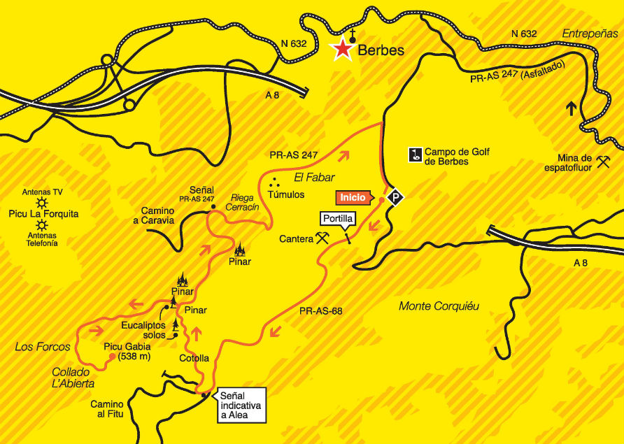 Depuis le terrain de golf de Berbes, nous prenons la piste au Fitu puis un sentier à droite sans signalisation faisant le tour du Pic et qui se rejoint avec une piste qui monte du PR AS 247, endroit oú nous tournerons à gauche pour commencer l’ascension au pic. Le retour se fait par une belle piste entre pinèdes qui débouceh su PR AS 247 et sur le point de départ.