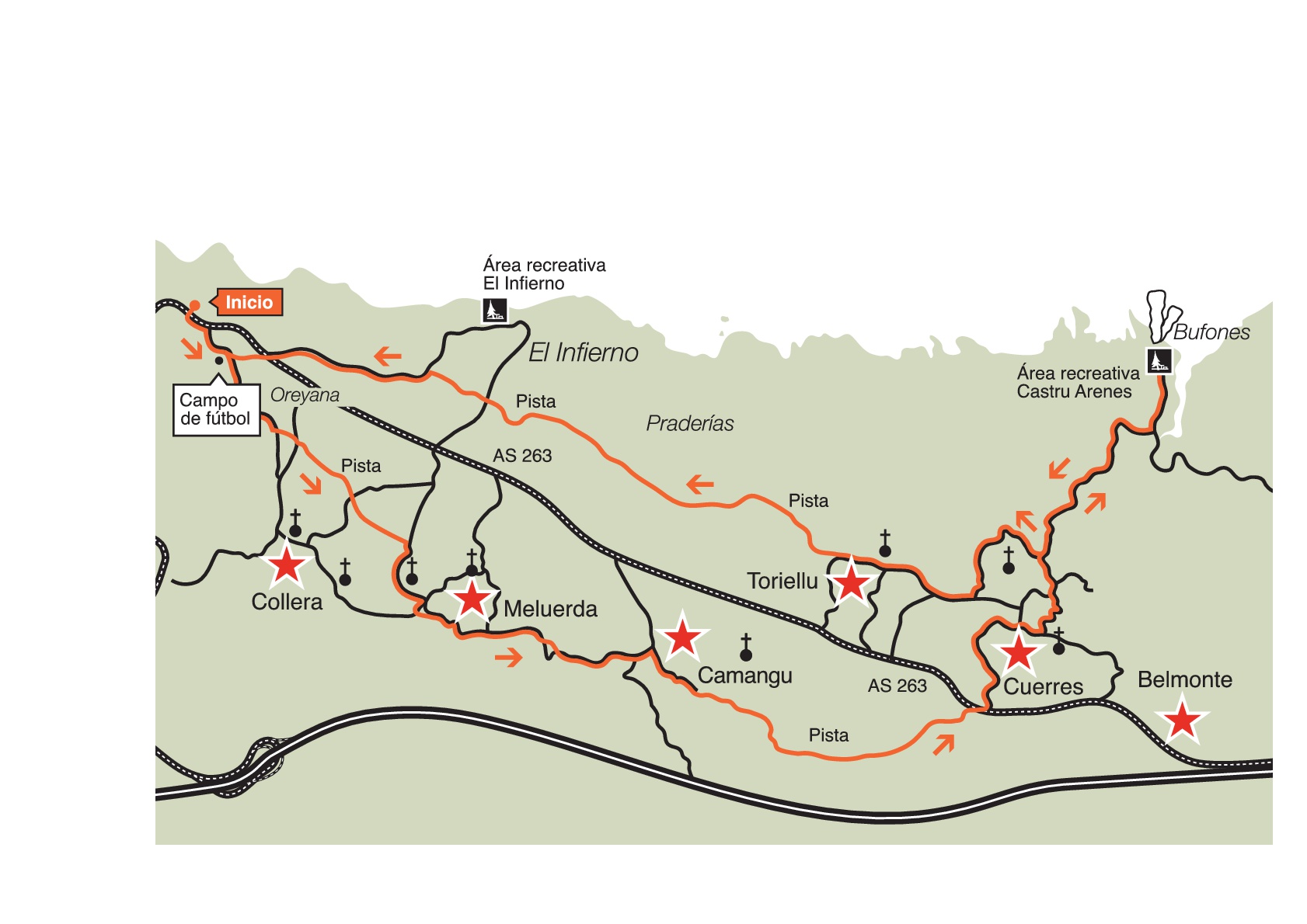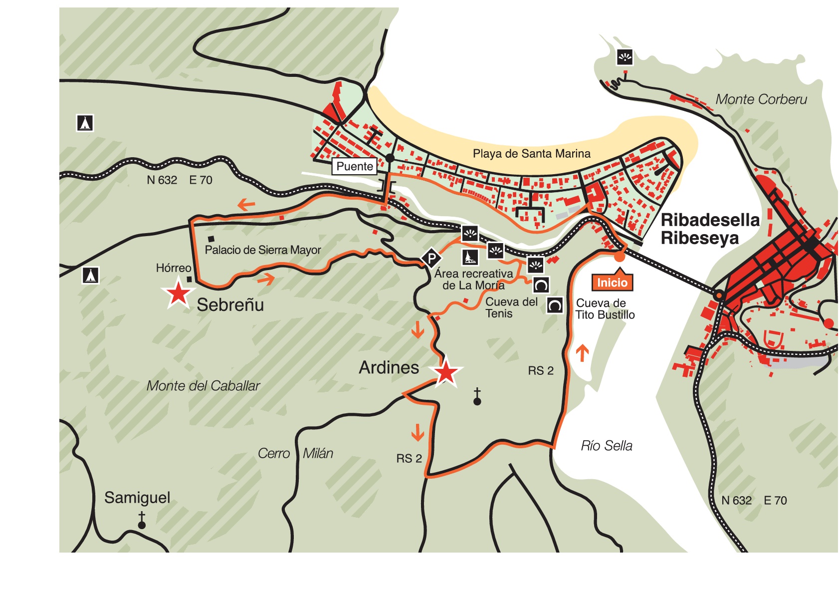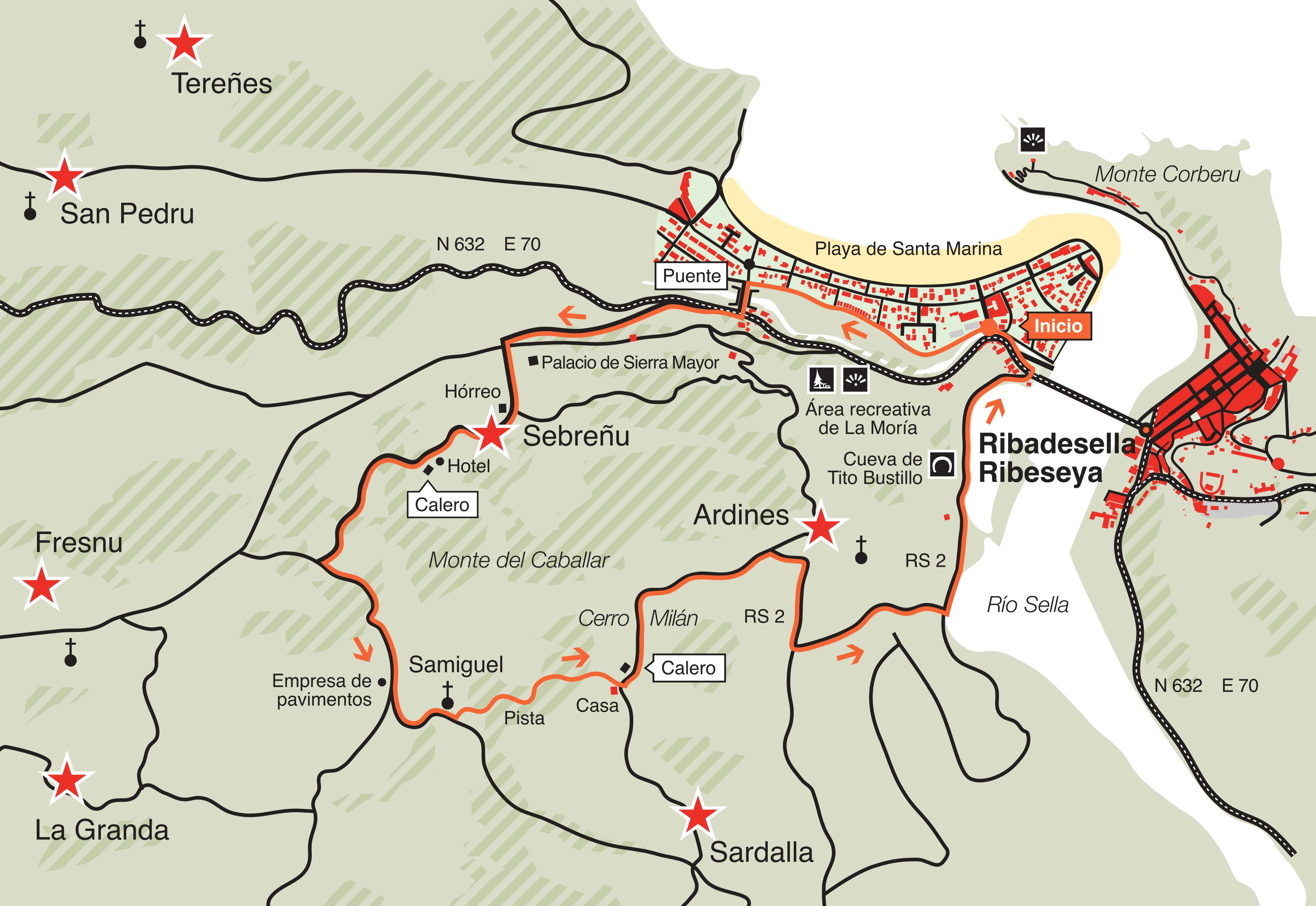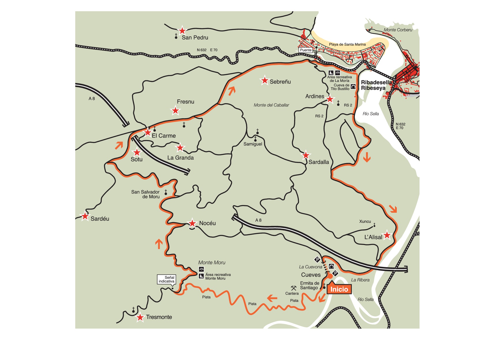 Le parcoyurs commence dans la Cuevona de Cueves, villaje qui est le portrait fidèle du profit agricole de la vallée fertile du Sella, pour après Monter par une piste jusqu’au mirador de Monte Moru. Le chemin de retour traverse les villes les plus singulières de la partie occidentale de la commune, telles que El Carmen, où le Musée du Territoire de Ribadesella est placè.