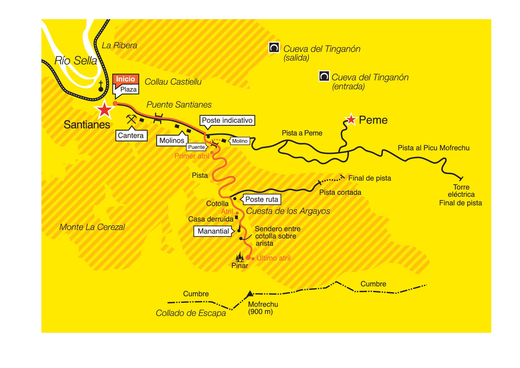 Chemin de haute montage. Depuis Santianes nous montons vers le villaje de Peme. Toujours en faisant le tour du sommet, nous arriverons à la dernière tour électrique; endroit où nous tournerons vers l’Ouest pour se lancer, du Coteau de la Tabla, à la dernière ascensión vers le sommet qui nous conduit au pic, d’où nous profiterons des belles vues du Pics d’Europe et de la côte.