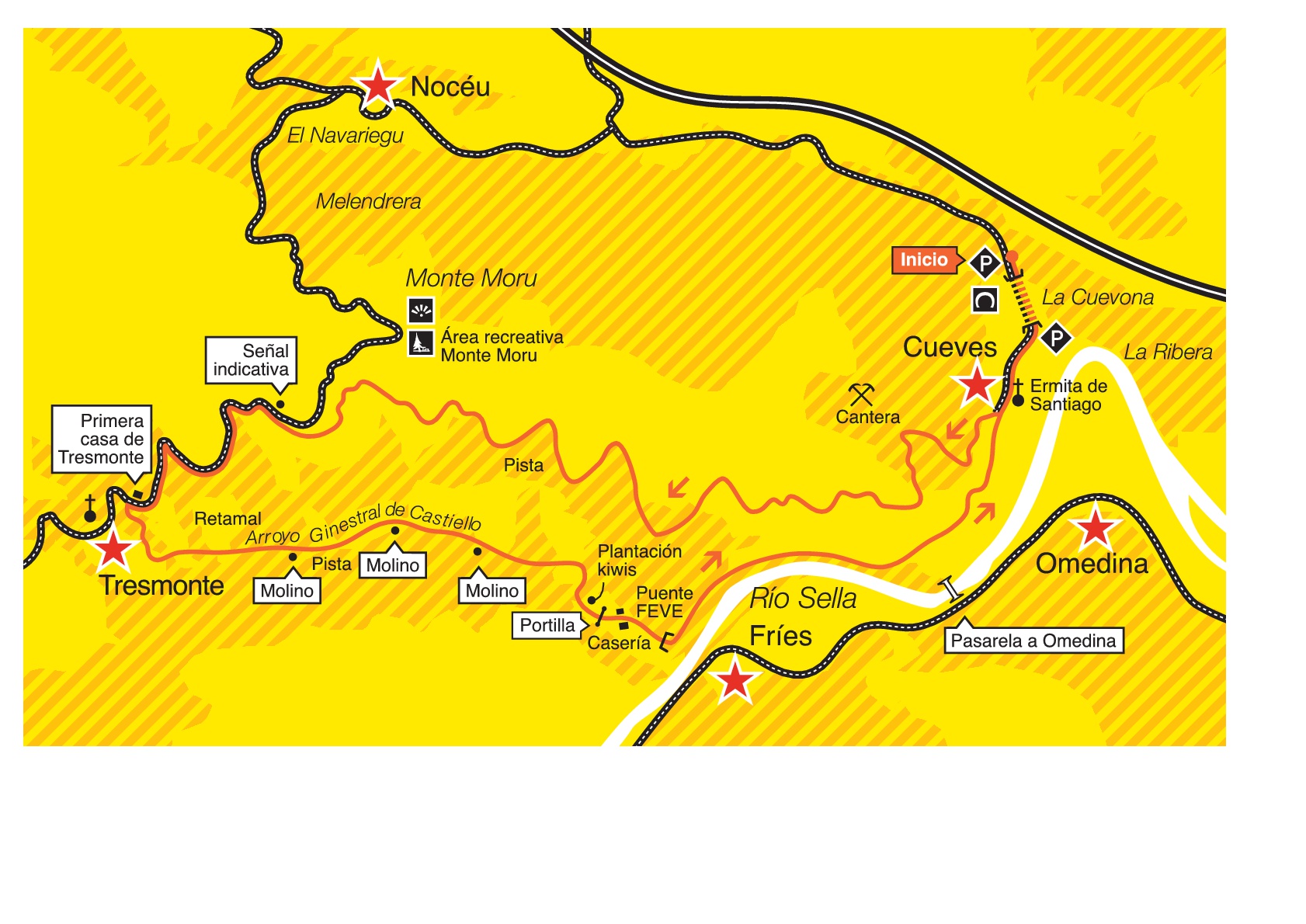 Chemin qui nous permettra d’observer plusieurs moulins traditionnels, quelques uns dèjá rehabilitès. Dèpuis Cueves nous marchons par une piste signalisèe qui monte jusqu’à la route de Tresmonte. Nous la descendons et une fois avoir dèpassè la première maison du villaje nous trouverons à notre gauche le sentier qui nous conduira au fleuve Sella et après, à Cueves.
