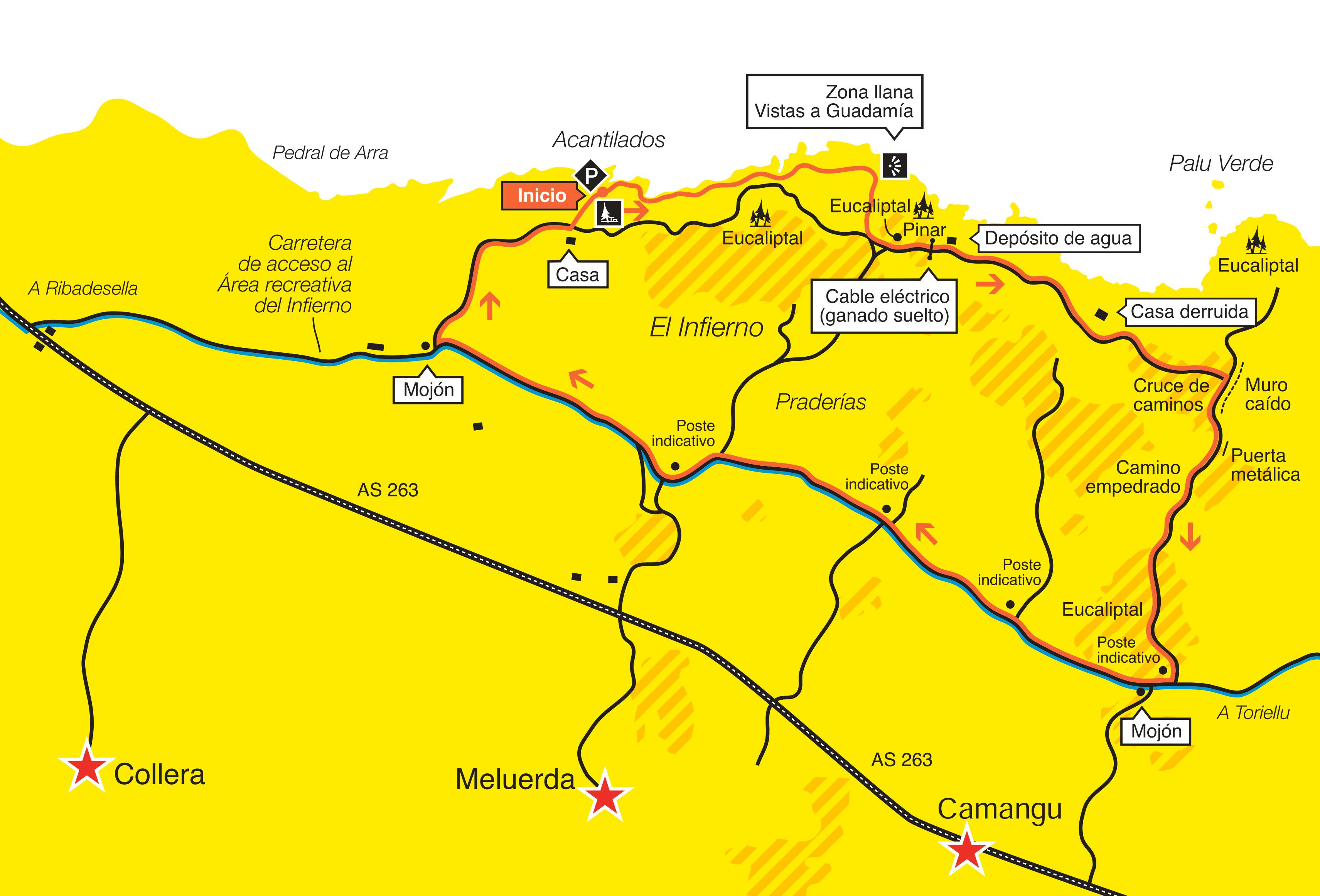 Depuis l’aire récréative de Guadamía et en parallèle aux falaises nous arrivons à la zone de Tomasón. Nous tournons vers le sud par un chemin de chariot vers Toriellu. Une fois traversè Toriellu et Cuerres nous arrivons à un pont sur le Guadamía et nous tournons vers le nord jusqu’à se rendre aux dernières maisons de Cuerres et que nord jusqu’à se rendre aux dernières maisons de Cuerres, et que nous nous approchons, à côté du Guadamía, de l’aire récreéative de départ.