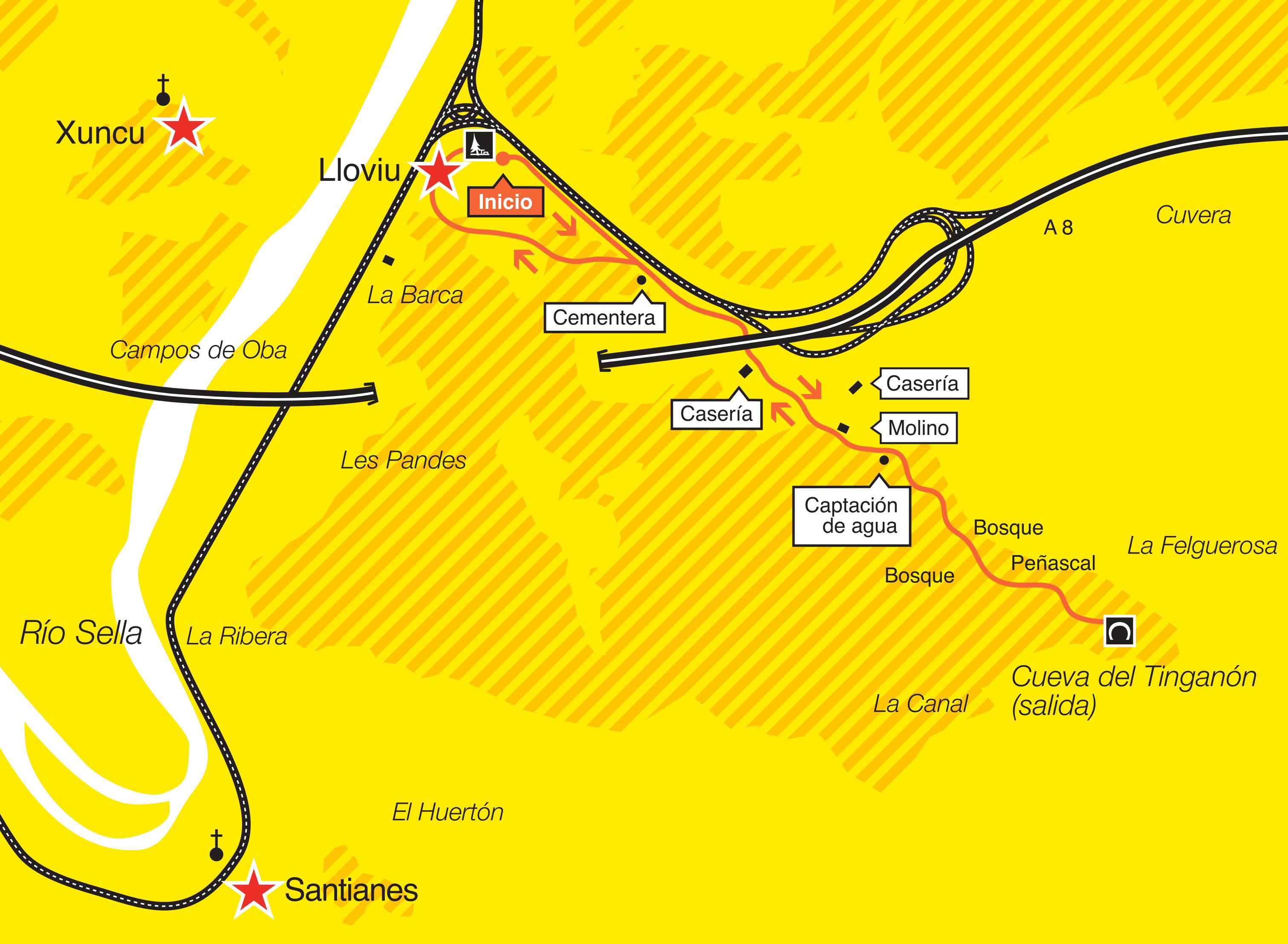 Difficile ascensión à la bouche de la spectaculaire Grotte du Tinganón à cause des caractéristiques du terrain. Depuis le rond-point de Lloviu nous avançcons à còt´de la voie d’accès à l’autoroute du Cantabrique. Depuis le centre d’accès d’exploitation de l’autoroute, nous continouns sur le sentier qui s’avance près du ruisseau qui prend sa source dans la grotte.