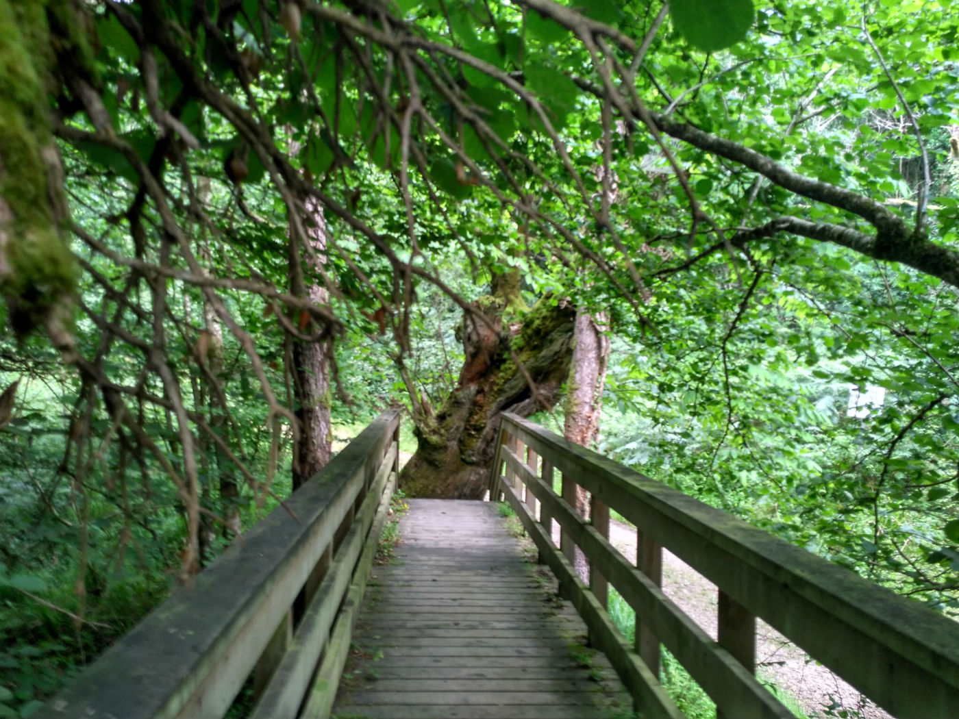 Seguimos caminando entre estas “caleyas” respirando el aroma 100% rural que esta población exhala hasta dejar el asfalto y comenzar a andar por una senda bien marcada y señalizada. Empezamos entonces a intuir lo frondoso del lugar. Caminando entre avellanos, saúcos y allorus, alcanzamos en un tiempo breve un puente de madera ya sobre el río Obaya. Al final del puente aguarda firme y centinela un castaño centenario de extraordinaria belleza.