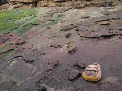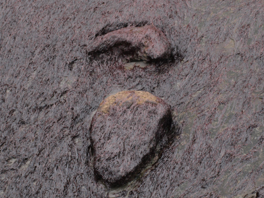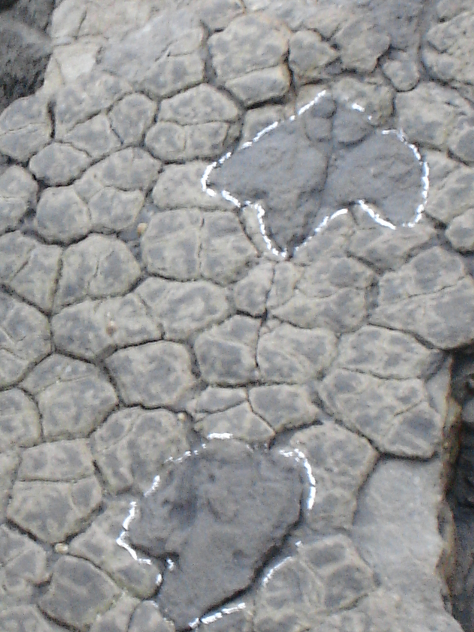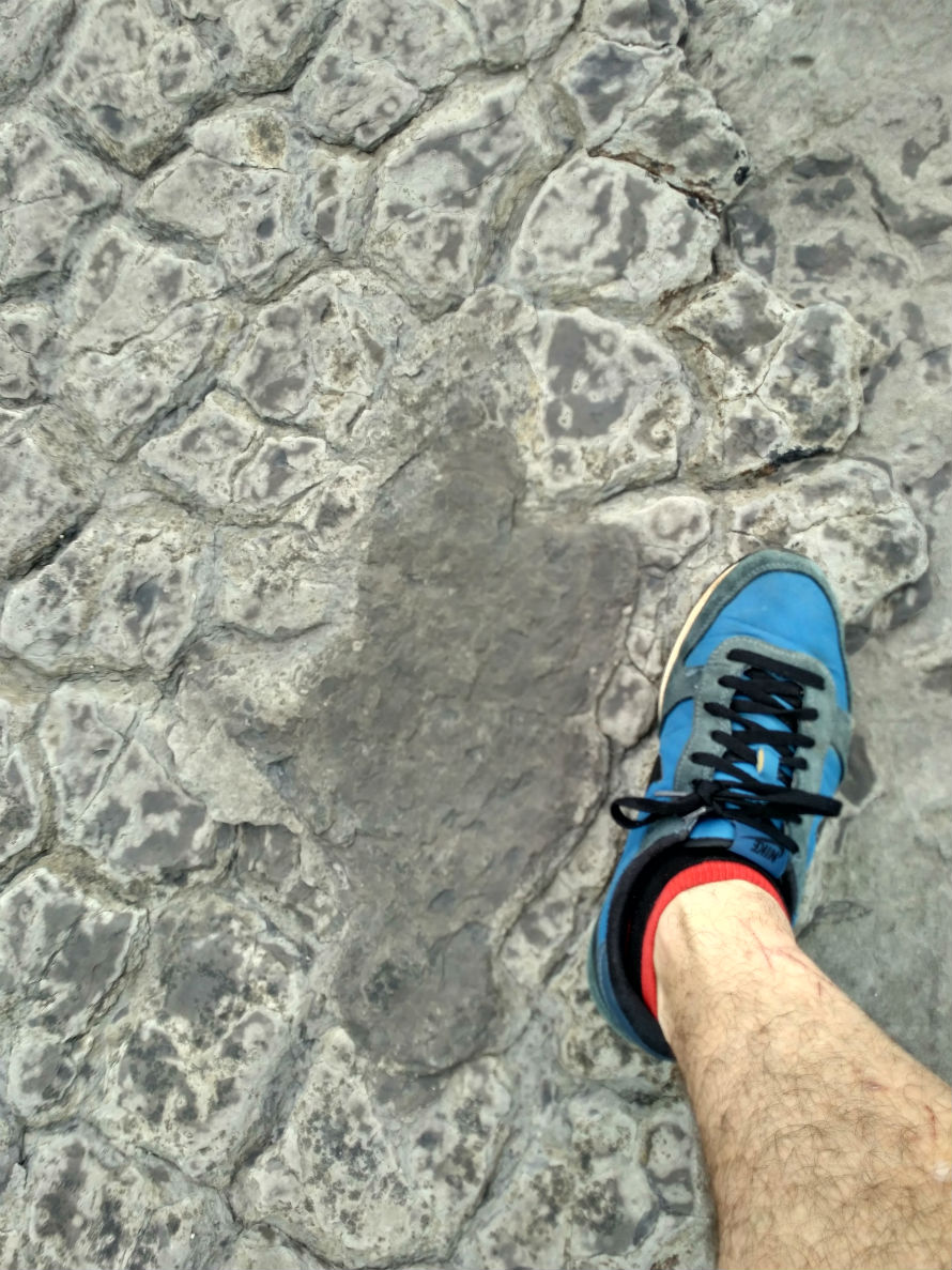 Regresamos a la plataforma. Continuamos dirección oeste a unos 90 metros de la escalera. Encontraremos en la parte más alta del acantilado un estrato inclinado hacia el mar donde nos resultará muy fácil identificar el rastro de un saurópodo. Se encuentran conservadas en altorrelieve, lo excepcional de estas huellas de dinosaurio es identificar el rastro de un par de “ huellas mano-pie “ .