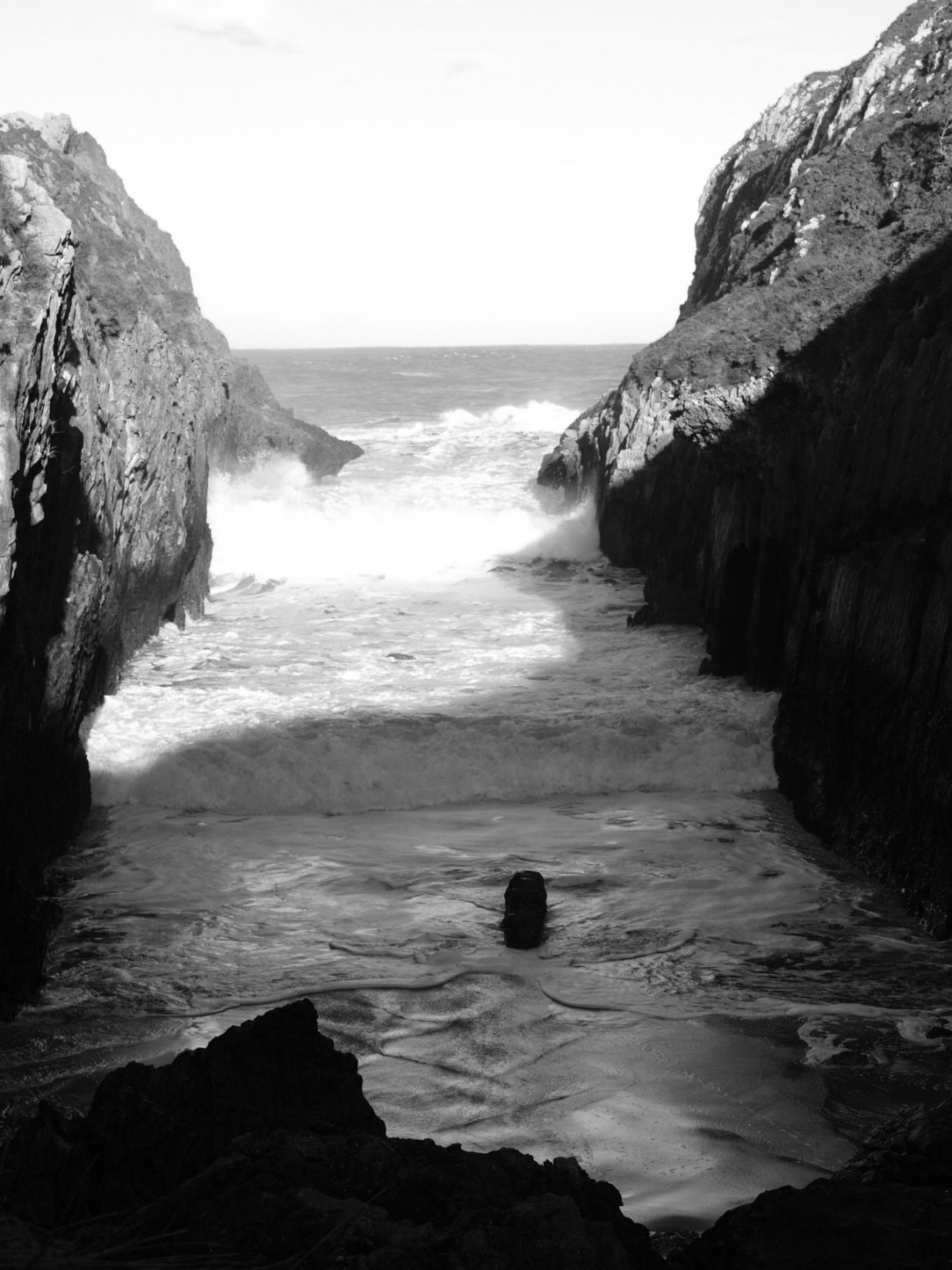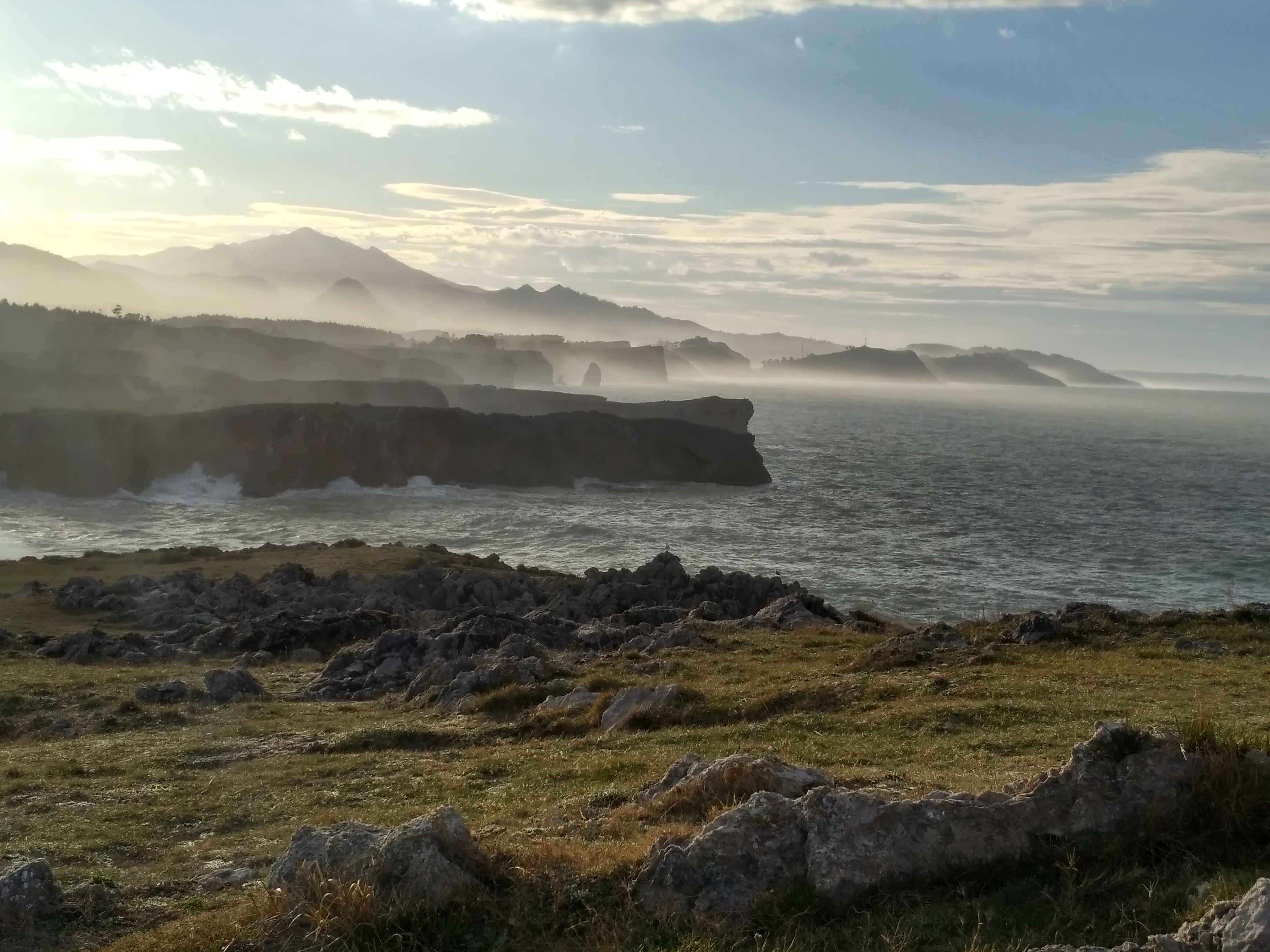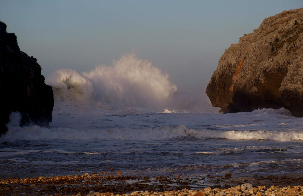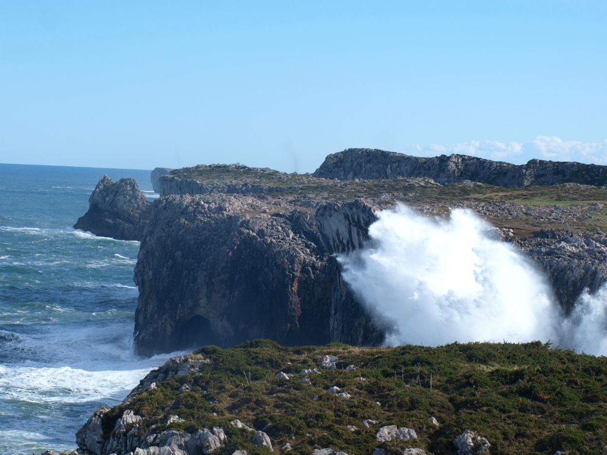 If the sea is calm, many of the ventilation shafts belonging to the underground cavities only emit the air compressed in the galleries by the tide. However on those days when the tide is high with a strong swell, El Bramadoriu is transformed into a stunning spectacle, the wáter and air expelled form the subterranean vaults reaches tens of metres into the air. The walling sound as the holes explode into the open air can be heard hundreds of meters away. On occasion, it can be Heard from the outskirst of the Picos de Europa. It`s not without reason that the shepherds hereabouts say, “when you can hear the Bramadoriu, collect wood for the days to come!”.